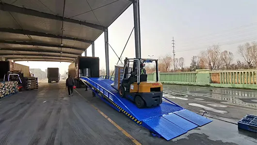 移动式登车桥是与叉车配合使用的货物装卸专用辅助设备,适用于仓库、工厂、用于现场无装卸货平台或需要流动装卸货物的场所